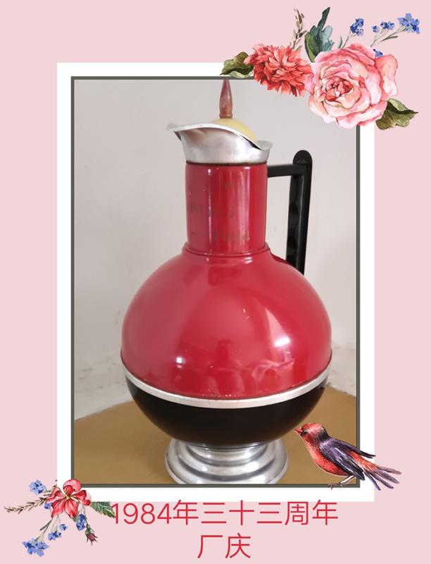 记忆一:暖水瓶——1984年金猴创立33周年时企业给职工发的纪念品。这是一件造型别致的暖水瓶,由壶盖、壶身、壶座、壶把组成,壶盖类似于蒙古帽,壶身形状类同瓷器中的天球瓶。整个壶体由红黑银三种颜色互相衬托,显得端庄大气又不乏时尚感。以八十年代初期的生产技术水平,这种工艺造型的暖水瓶已经很超前了。由于该纪念壶距今已近四十年,当时工厂规模小,职工只有几百人,只发给“正式工人”和“亦工亦农”,所以数量不多,且又是生活必需品,报废率高,存世量少,具有一定的收藏价值。