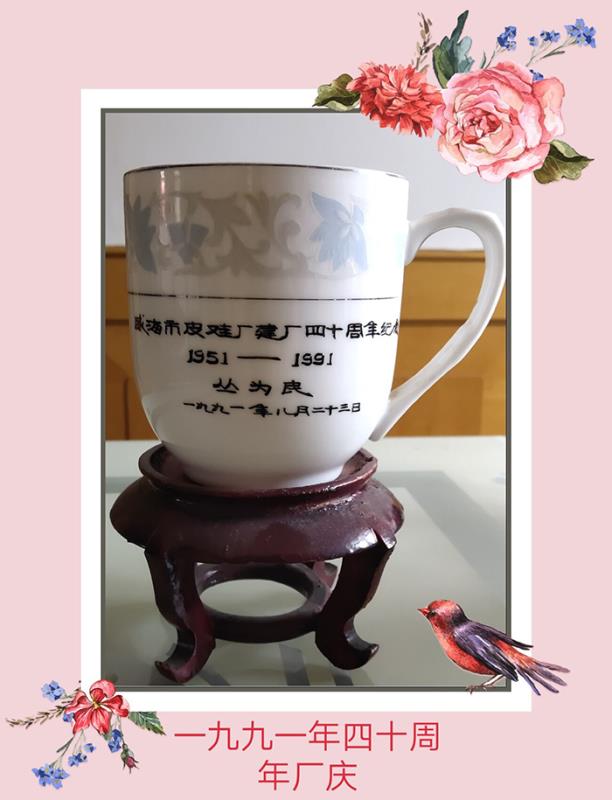记忆二:陶瓷水杯——1991年金猴创立40周年时企业为职工定制的专属陶瓷水杯。1989年威海市二轻工业局改组了威海市皮鞋厂领导班子,年轻的带头人柳富林厂长新官上任点燃了三把火:一是抓拳头产品,重奖设计人员;二是拓展销售市场,打开产品渠道;三是扩大企业规模,提升生产能力。到1991年四十周年厂庆的时候,企业已经摆脱了困境,技术、销售、生产三条战线处处充满生机和活力,企业取得了长足的发展。这一年,企业合并了“威海市皮鞋材料厂”,“威海市皮鞋厂”改名为“威海市皮鞋工业集团公司”。为了鼓励广大干部职工这种火热的工作激情,工厂派专人到中国四大瓷都之一的淄博,为每位干部职工定制了这款专属陶瓷水杯。这个陶瓷水杯“白如玉,明如镜,薄如纸,声如磐”,是一件非常精美且具有纪念意义的陶瓷制品。