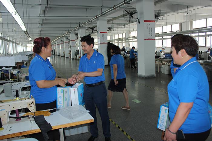 在发放慰问品的同时,邹主席还与部分皮具公司的干部职工进行了交谈,代表工会组织向一线职工致以崇高敬意和亲切慰问,并督促皮具公司落实好各项防暑降温措施:一要营造良好工作环境,优化配置生产流水线,保持车间宽敞明亮通透;二要加大技术改造力度,采购先进生产设备,降低职工的劳动强度;三要科学安排生产进度,如遇极端高温天气,可安排职工下午避暑休假;四要全面加强人文关怀,购置安装大型电风扇,发放绿豆汤和雪糕,及时补充车间药箱里的藿香正气水等防暑降温药品。