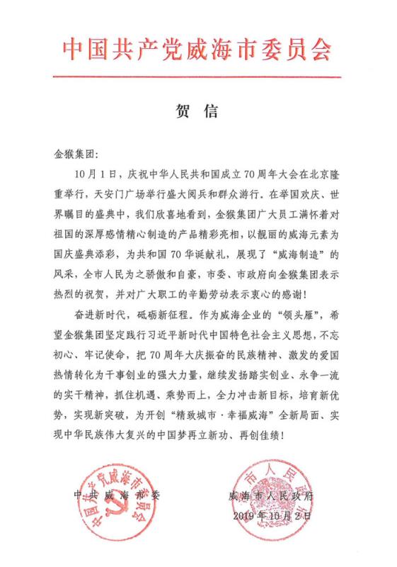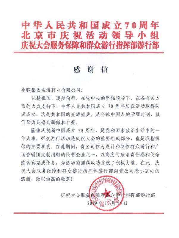 在各级党委、政府的正确领导及各界朋友的关心支持下,成人论坛 圆满完成了庆祝新中国成立70周年阅兵的保障任务,为威海也为金猴自己争了光。