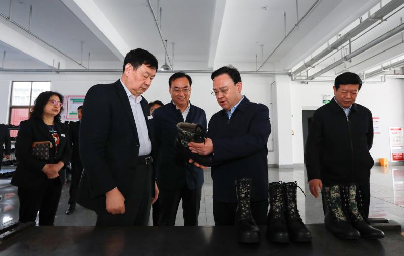 市委副书记、代市长闫剑波(右二)在集团党委书记、董事长柳富林(右四)的陪同下视察鞋业生产车间