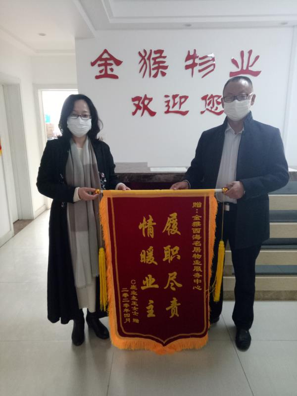 新冠肺炎疫情防控期间,各小区、办公楼悬挂横幅、张贴告示、设置口罩投放垃圾桶等方式敬告业主如何进行安全防护。由于公交停运,为了保证员工每天按时到岗,西海名居唐晓娜主任和新外滩名居于坤明主任,自己每天开车40多公里往返于经区和高区接送上下班的员工。正是物业员工通过自己精细的服务,内防外控、严防死守,保证了金猴物业在管小区3800多户没有发生一例感染病例。